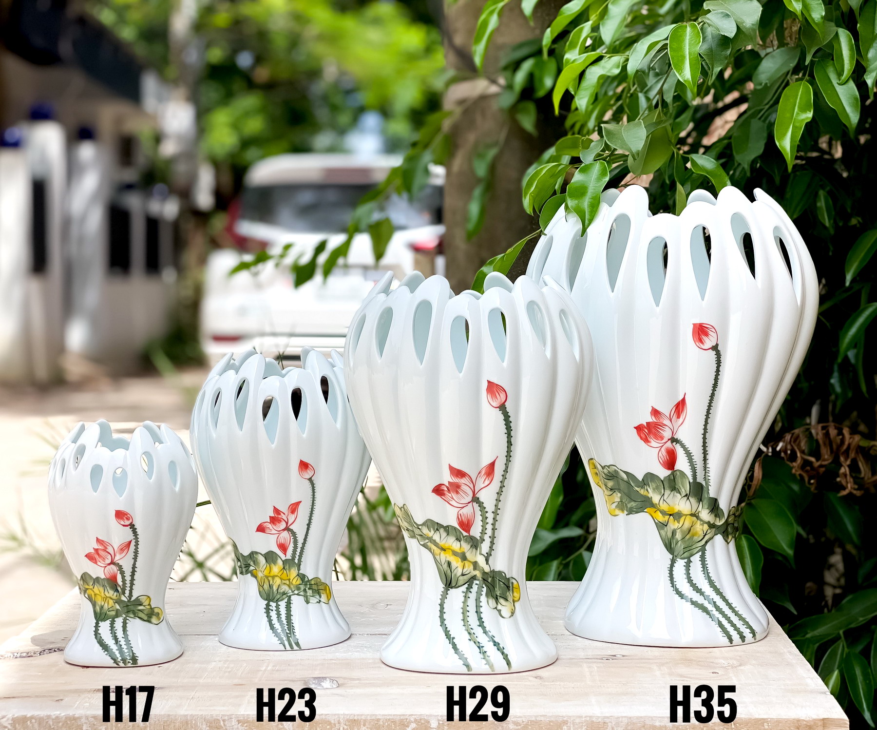 – Lọ hoa dáng hình bàn tay gốm sứ Bát Tràng men trắng bóng vẽ hoa sen, sản phẩm có 4 kích cớ khác nhau được cắt trổ các mắt lỗ xung quanh rất công phu và tỉ mỉ giúp cho khách hàng có thể cắm hoa được nhiều hơn với nhiều kiểu dáng khác nhau.