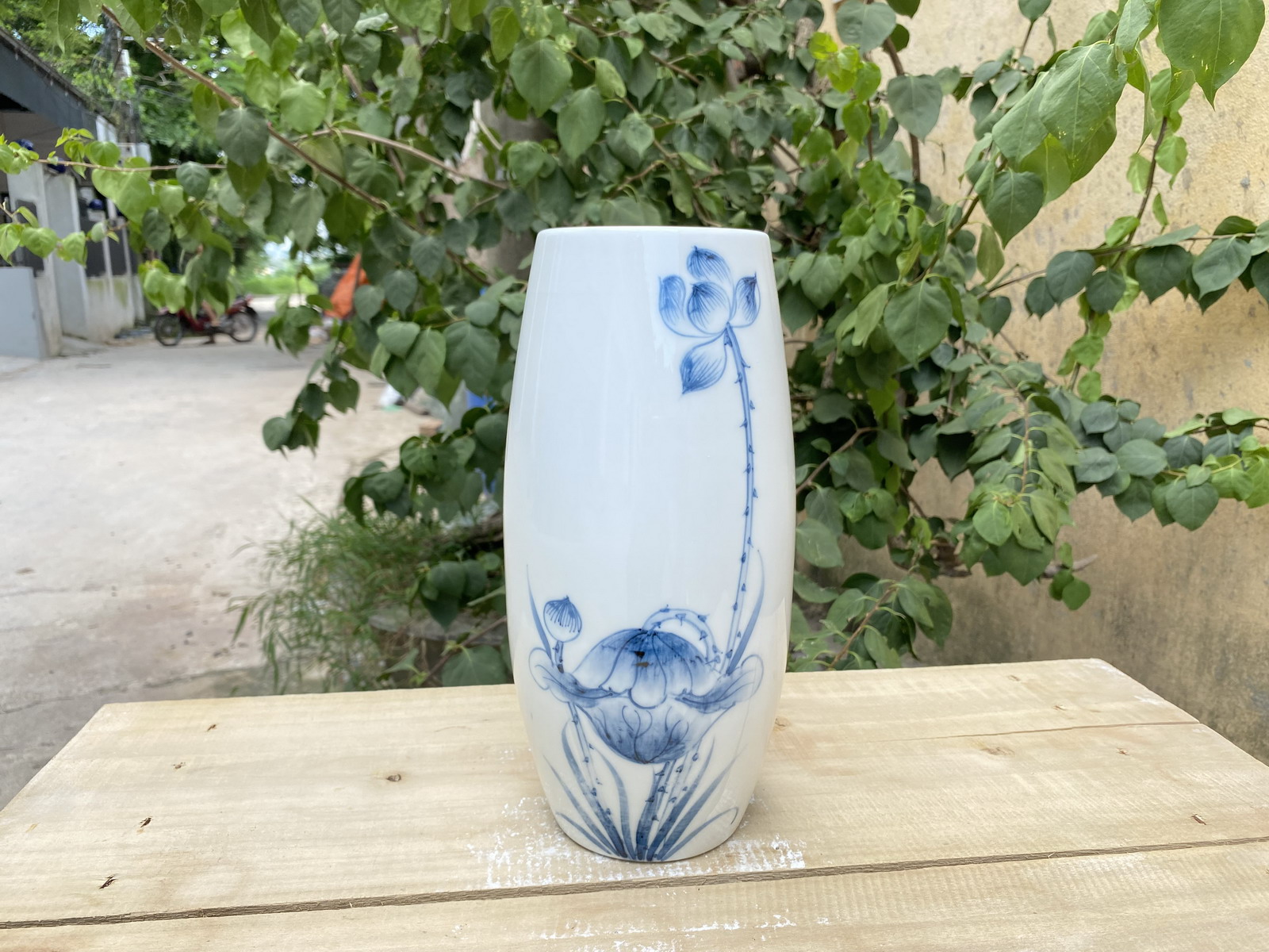 Lọ hoa gốm sứ Bát Tràng dáng bom men trắng bóng vẽ họa tiết sen đơn mầu cô ban.